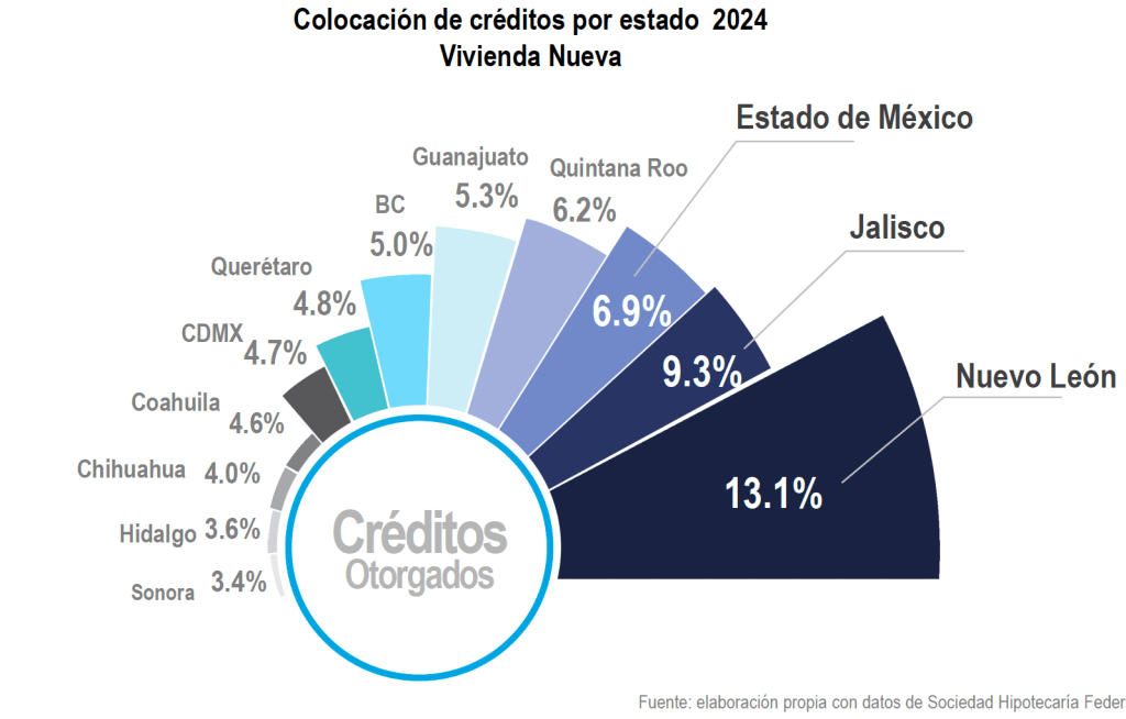 De acuerdo con el análisis “Perspectivas del Mercado Inmobiliario 2025” elaborado por Tinsa México by Accumin, Nuevo León lideró la colocación de créditos hipotecarios en el país durante 2024 con el 13.1% del total, seguida por Jalisco (9.3%) y Estado de México (6.9%). La participación de estos tres estados en la colocación de créditos fue muy similar a la de 2023.