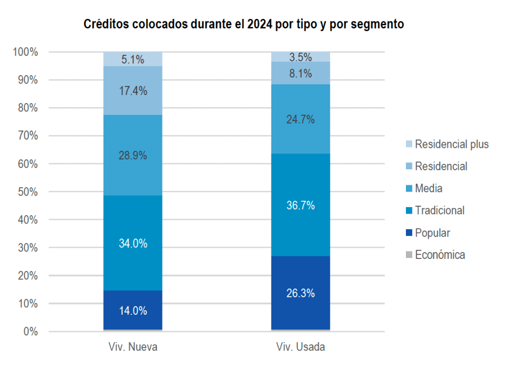 Por segmento, el mayor porcentaje de créditos hipotecarios se destinan a vivienda tradicional y media. Destacando la vivienda usada en el segmento tradicional y la nueva en el segmento de vivienda media.