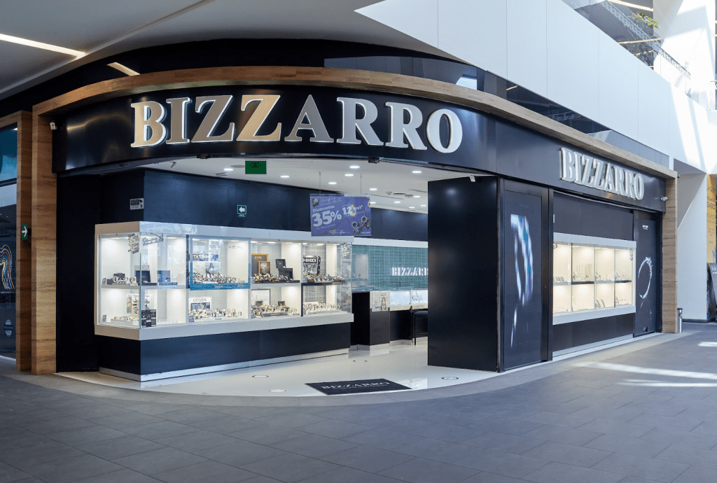 BIZZARRO somos una joyería mexicana consolidada por el talento de nuestros colaboradores. Desde 1979 materializamos sentimientos y emociones en preciosas joyas. Esto nos convierte en cómplices de los momentos inolvidables de cada uno de nuestros clientes. Nuestro referente más destacado es la comercialización de joyas de oro de 14k con gemas preciosas. Pero los diamantes son nuestra especialidad. Además de colaborar con las marcas relojeras más trendy. En la actualidad contamos con más de 130 sucursales en todo el país, además de una plataforma para compra en línea http://www.joyeriasbizzarro.com/