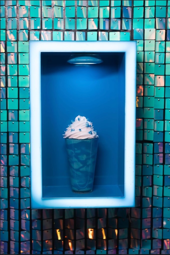 1. Se licúan 60 ml de Baileys Chocolate, 90 ml de leche, 15 g de azúcar, hielos y 6 gotitas de colorante alimentario azul (porque aquí todo tiene solución).