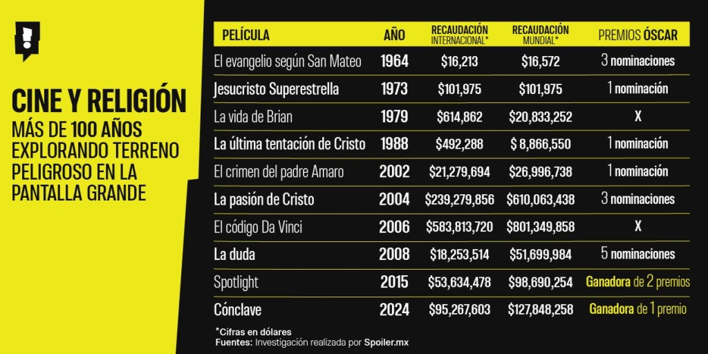 De acuerdo con lo arrojado en el conteo de Spoiler.mx, El Código Da Vinci y La Pasión de Cristo son los filmes religiosos con mayor taquilla a nivel mundial, probando que la audiencia está constantemente atraída por conocer, por un lado, nuevas perspectivas y misterios alrededor de la historia de Jesús, pero por el otro, también busca versiones más fidedignas, sin importar qué tan crudas sean.En cuanto a los premios, hablando específicamente de la academia, se muestra una clara preferencia por hechos más apegados a una realidad tangible, como lo fue el escándalo mediático de Spotlight y el proceso de elección papal reflejado en Cónclave.