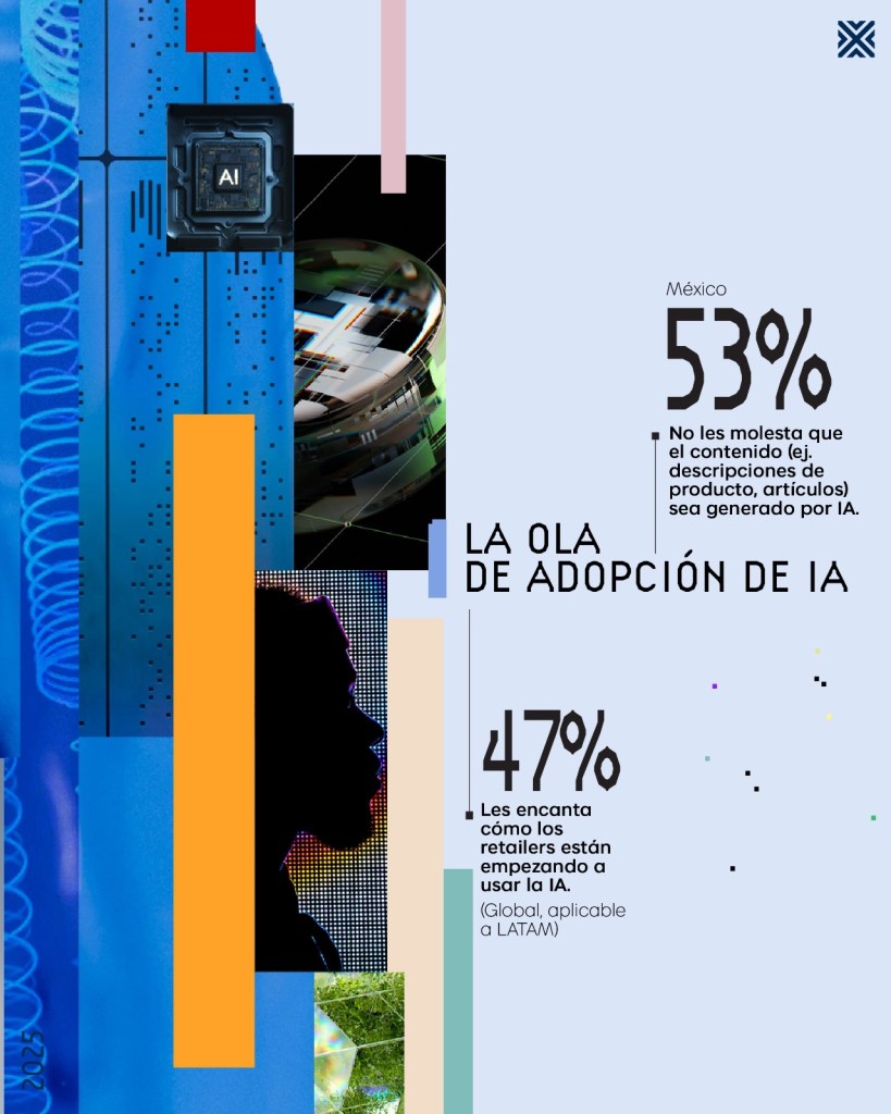El informe pone además en evidencia el poder y la normalización de la inteligencia artificial en el proceso de compra online: 68% de los consumidores ha usado IA (ChatGPT u otras), 47% valora cómo las marcas la están implementando y 46% no se incomoda con contenido generado por IA. Junto a estos datos, el reporte introduce el concepto de Agentic AI —asistentes capaces de negociar y comprar en nombre del usuario—, una tendencia que entusiasma a cerca del 48% de los encuestados y que plantea nuevos retos sobre visibilidad, datos y cómo competir en un mundo donde la decisión de compra puede pasar por algoritmos.