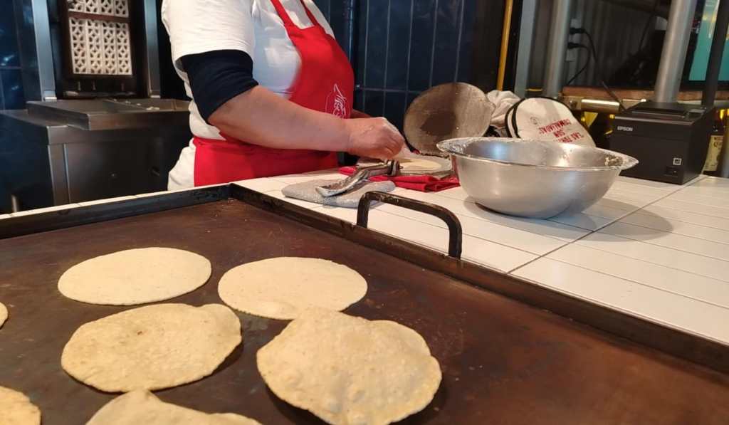 Cerca del centro del restaurante se encuentra el trompo y una mujer realizando tortillas hechas a mano. Ese detalle me parece muy bonito porque remite directamente a esas cocinas típicas y tradicionales donde no solo eliges el guiso, sino que ves el proceso. Aquí no te dicen que son tortillas hechas a mano: lo estás viendo. Ves cómo se forman las bolitas de masa, cómo pasan por la prensa y cómo terminan en el comal grande. Y eso importa, porque la tortilla aporta un sabor base: suave, pero potente.
