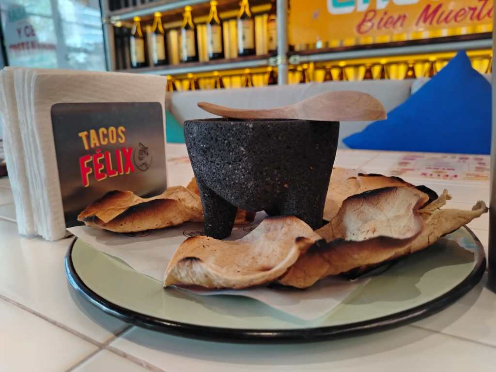 La mesa ya estaba equipada con las tradicionales servilletas, un combo de tres salsas y, lo mejor, unas tostaditas que rodeaban un molcajete grande repleto de salsa. La mesa es amplia, y eso se agradece: desde el inicio te permite imaginar que, independientemente de lo que pidas, habrá espacio suficiente para disfrutarlo. No tienes que apretar los platillos ni amontonarlos; puedes pedir con total comodidad.